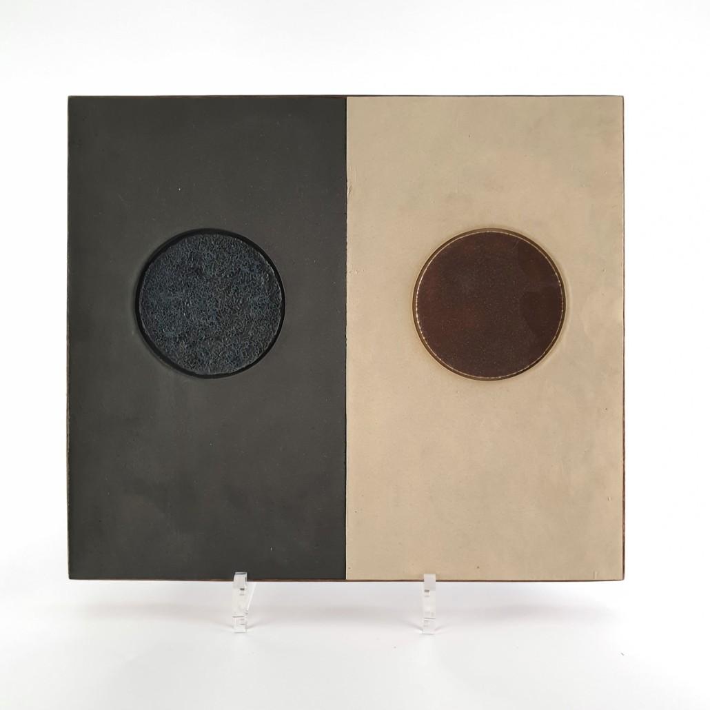 | omschrijving/nomenclatuur | Steengoed, (kristal)glazuur, ingelijst in hout |