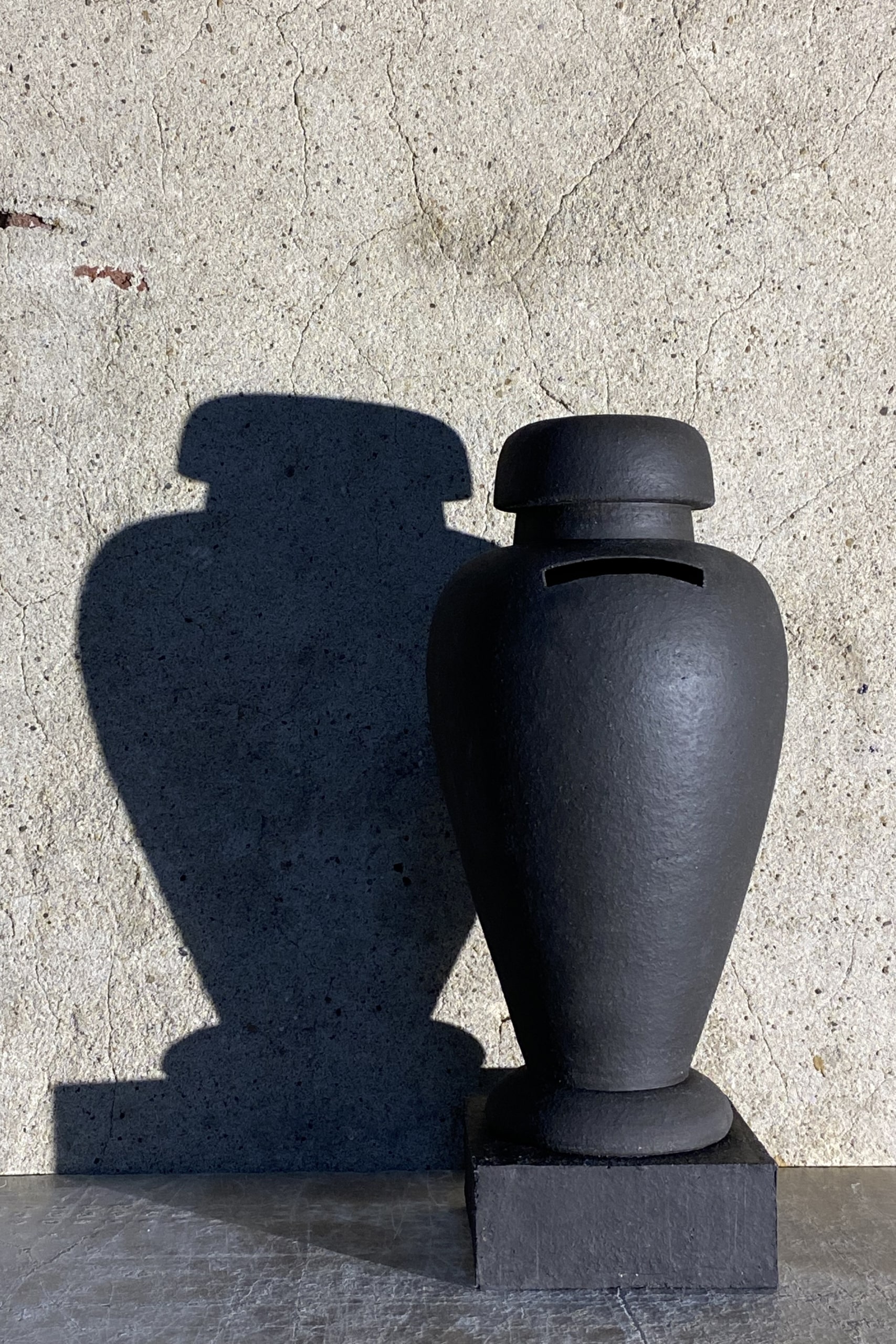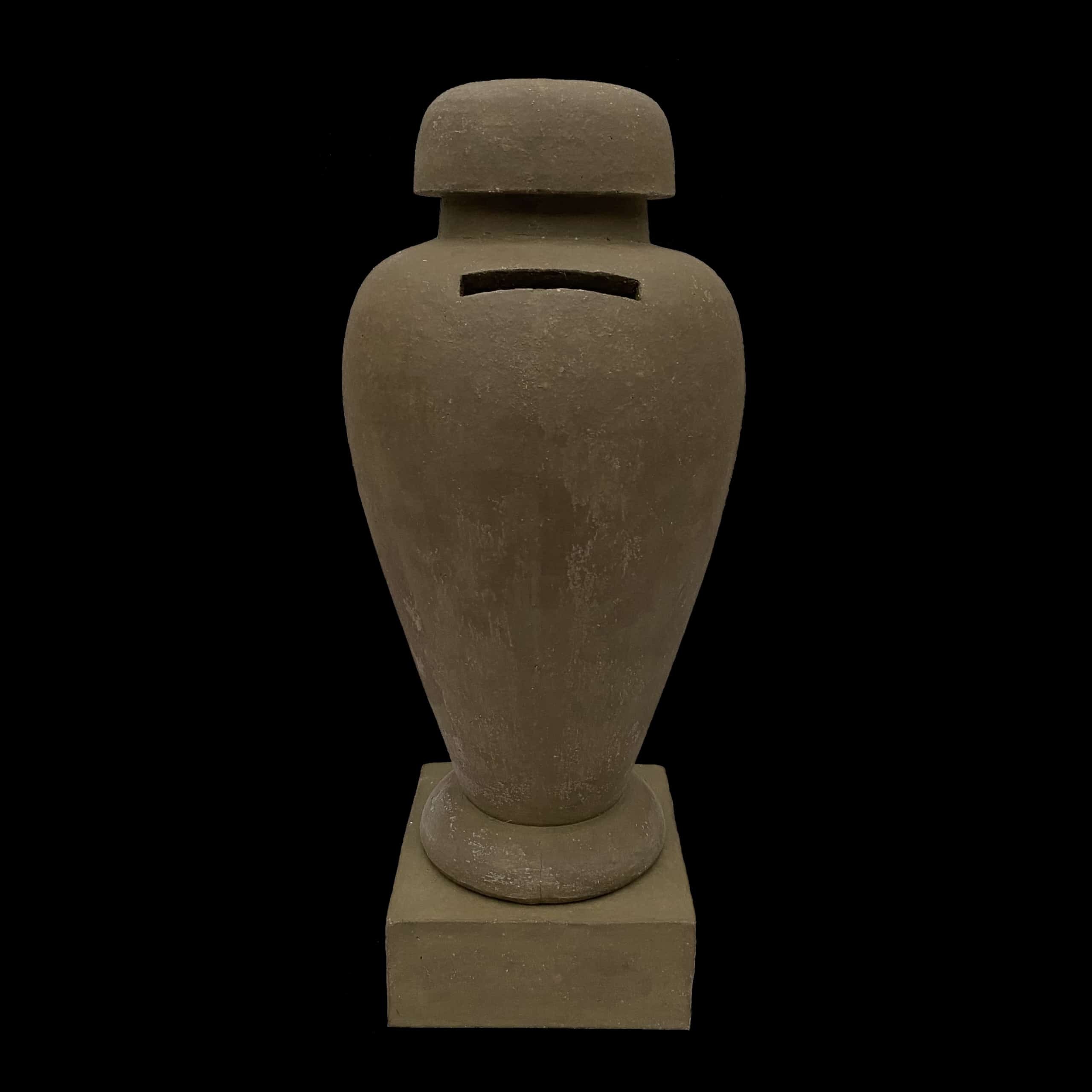 An Egyptian obelisk on a pallet awaiting transportation; a bullet with a bishop’s mitre; an oil drum with imperial wings … Heiko Balster amalgamates striking political, religious and economic symbols to create a series of Monuments and Souvenirs from the Anthropocene. Together they tell numerous interwoven tales of violence and exploitation, justified by ideals, faith or national glory. Each work has the potential to set off a train of thoughts. Earn, for instance, an urn turned into a piggy bank, prompts the notion that the chances people get in life increasingly depend on inherited wealth … wealth is accumulated by saving … ruthless cost-cutting leads to fatal consequences in construction work, health insurance, and so on. With humour and compassion – that sarcophagus with a soda-can lid, the tiger rug with an excavator bucket for a head! – Balster stares our present predicament straight in the eye. And he doesn’t flinch.